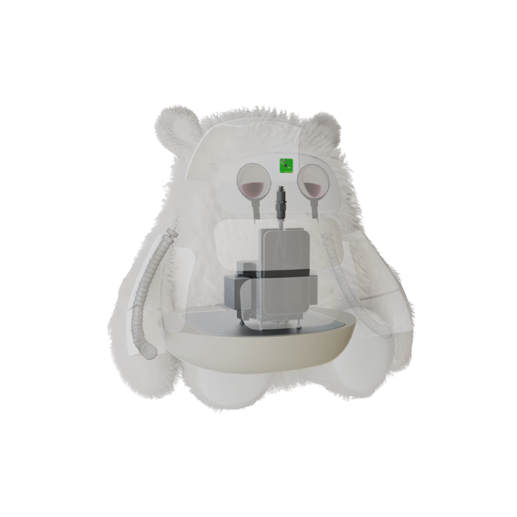 Huggable Arms: Made of flexible and ecofriendly material with a builtin inflation device. It automatically inflates and unfolds in- to a hugging curve upon touch induction, simulating the soft wrapping feel of a real hug.